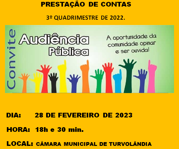A CÂMARA MUNICIPAL CONVIDA TODOS PARA PARTICIPAREM DA AUDIÊNCIA PÚBLICA, QUE SERÁ REALIZADA NO DIA 28 DE FEVEREIRO DE 2023 AS 18:30.