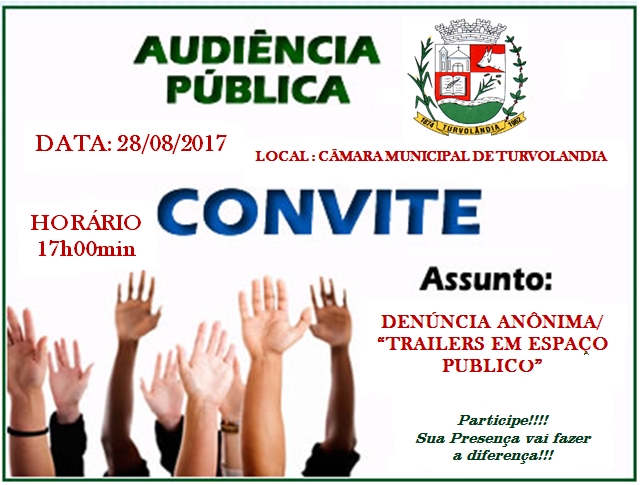 Convidamos a todos para participar a Audiência Pública, na Câmara Municipal de Turvolândia dia 28 de Agosto de 2017 as 17:00 horas no Plenário “Vereador José Patrocínio Sabiá”