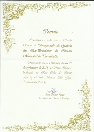 É COM MUITA HONRA QUE A PRESIDENTE DA CÂMARA MUNICIPAL DE TURVOLÂNDIA/MG, EM NOME DE TODOS OS VEREADORES, CONVIDA A TODOS PARA PARTICIPAR DA SESSÃO SOLENE DE INAUGURAÇÃO DA GALERIA DOS EX-PRESIDENTES DA CÂMARA MUNICIPAL DE TURVOLÂNDIA/MG.